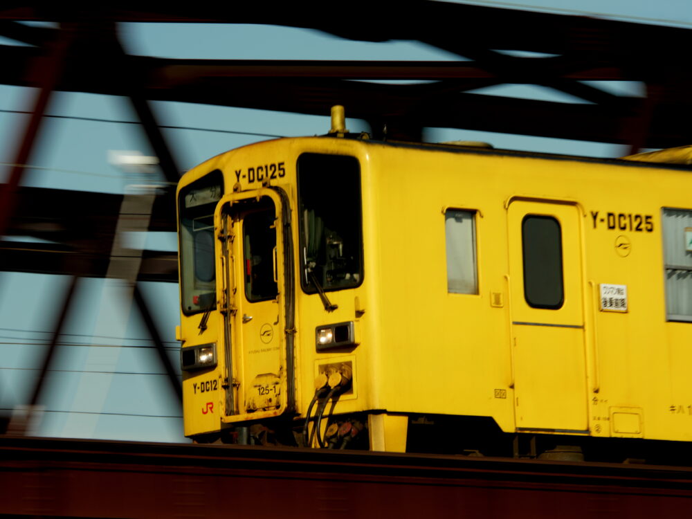 鉄橋を渡る「キハ125形」をパシャリ。 この目が覚めるようなイエローを見ると、「今日も一日頑張ろう」という気持ちになります。