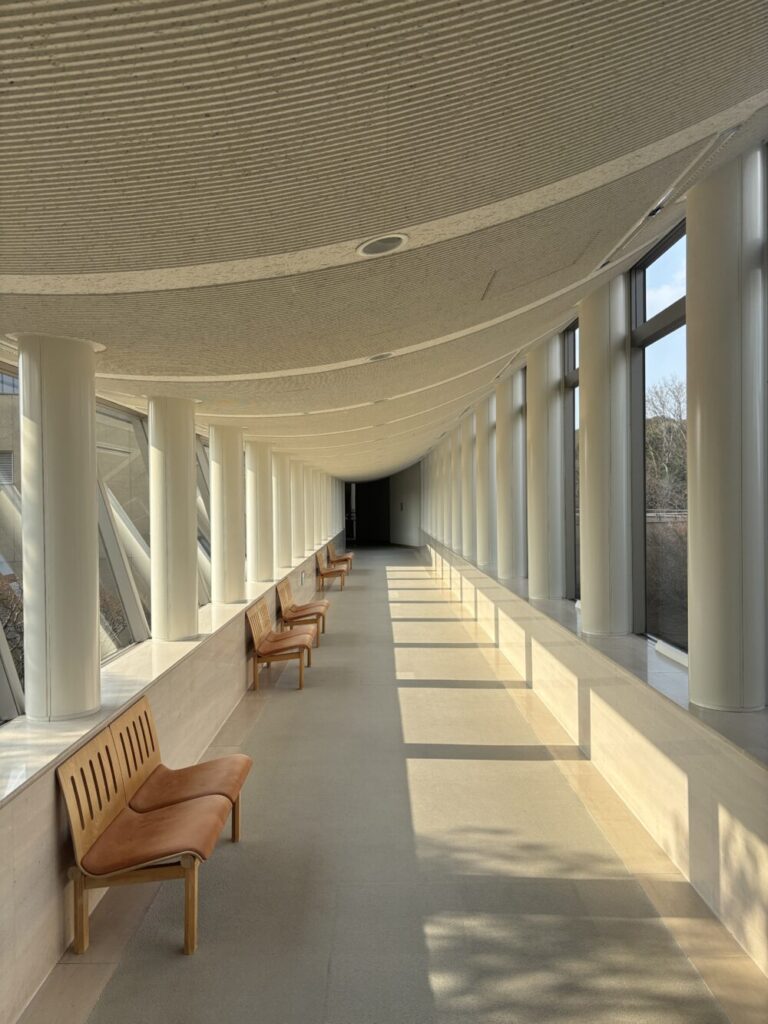 館内でも特にドラマチックなのが、緩やかなカーブを描く回廊です。 天井に施された同心円状のラインと、整然と並ぶ円柱。窓から差し込む陽光が床に長い影を落とし、歩くたびに景色がリズム刻むように変化します。設置された木製のベンチに腰を下ろせば、ただ通り過ぎるだけでは気づかない「静寂」を体感できるはず。
