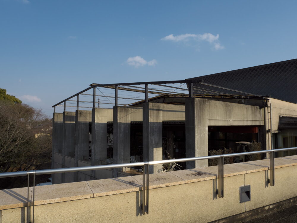 まず目を引くのは、空を鋭く切り取るコンクリートのフレーム。 直線的な梁や、空中に突き出したようなブリッジは、重厚なコンクリートでありながら、どこか軽やかで周囲の樹木と見事に共生しています。人工物と自然がぶつかり合う場所に生まれる「緊張感」こそ、この建築の醍醐味です。