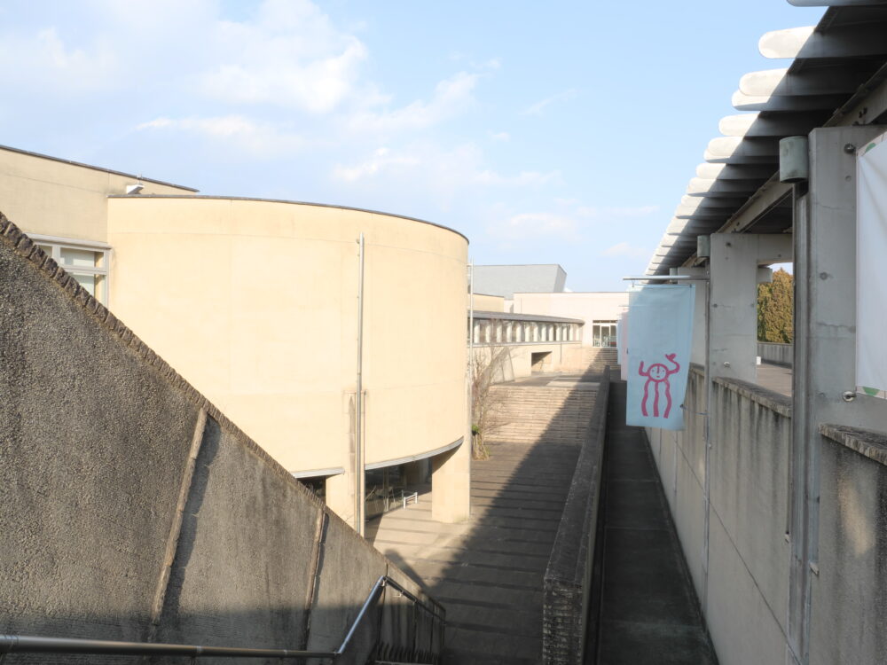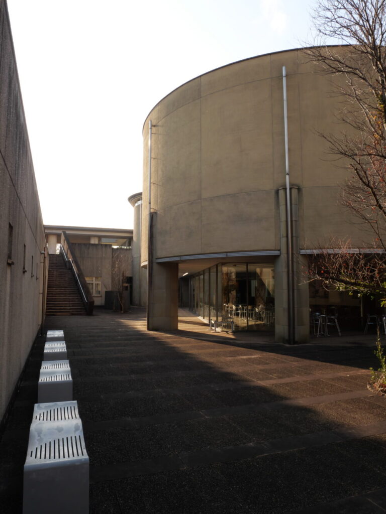 この美術館の面白さは、高低差を活かした複雑な構造にあります。 階段を上り、スロープを下り、円形の広場に出る。まるで迷宮を散策しているような感覚に陥ります。ふとした瞬間に見える建物の重なりや、旗がたなびく通路など、どこを切り取っても絵になる構図が隠れています。